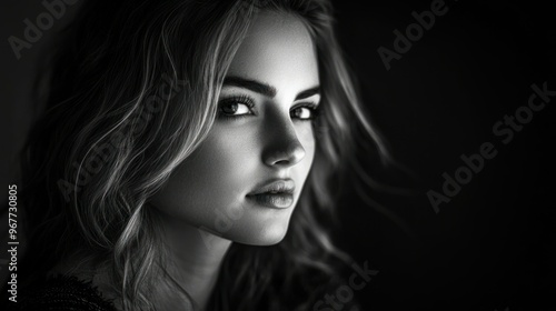 A striking black-and-white portrait of a young woman, showcasing her expressive features.