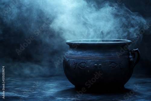 A striking cauldron rests in a dimly lit environment, shrouded in swirling smoke. This mysterious scene evokes feelings of magic and the unknown, perfect for fantasy themes.