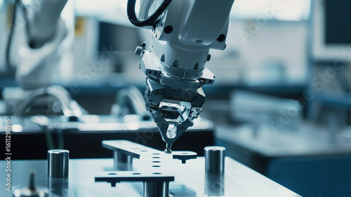 A striking close-up capturing the intricate moment of an industrial robot in action, as its precision-engineered mechanical arm extends with pinpoint accuracy to grab small, intricate precision parts.