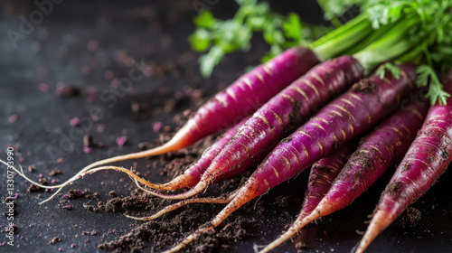 A striking close-up of a bundle of heirloom purple carrots, their deep hues contrasting beautifully against a simple monochromatic backdrop. The carrots appear freshly harvested, with soil traces ad