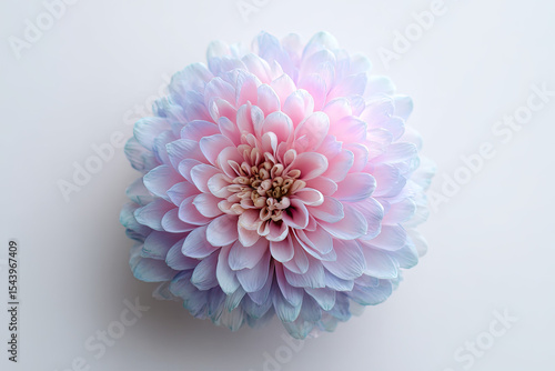 A striking closeup of a dahlia showcasing its intricate petals with a blend of pink and light blue hues against a pale background