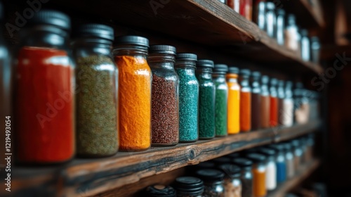 A striking composition of colorful spices presented in glass jars, arranged symmetrically on a wooden shelf, reflecting rich culinary traditions and the sensory experience of flavor.