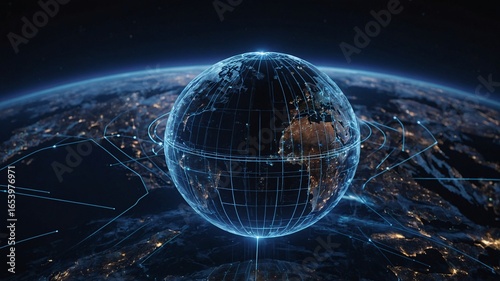 A striking digital representation of Earth, showcasing glowing lines of data connectivity against a starry backdrop.