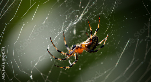 A striking garden spider patiently waits in its intricate web, sunlight illuminating its delicate legs and patterned body against a softly blurred green backdrop.