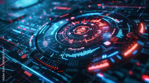 A striking high-tech control panel featuring circular and radial digital graphics, illustrating an advanced, modern, and technological interface for futuristic designs.