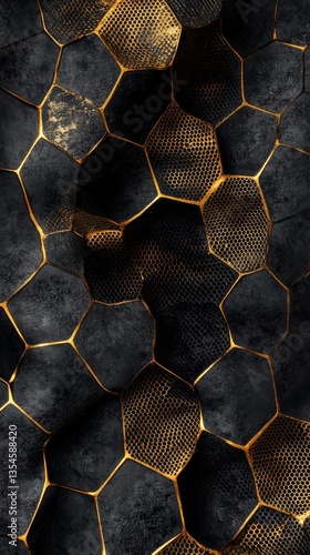 A striking honeycomb design with dark panels and golden accents, blending industrial and elegant elements, ideal for technology or luxury-themed projects.. AI Generation