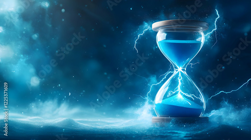 A striking hourglass filled with blue sand, set against a dynamic background of lightning and swirling mist.