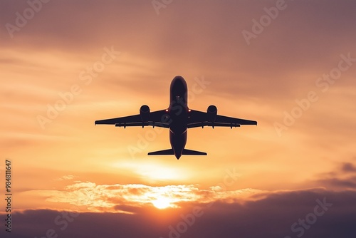 A striking image of an airplane soaring through the sky with a backdrop of a colorful sunset, highlighting travel and adventure.
