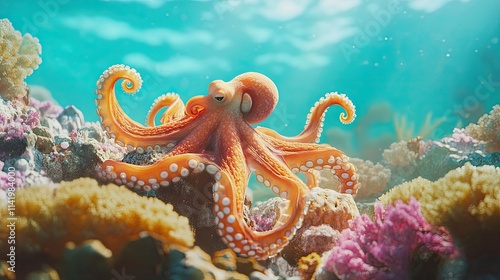 A striking orange octopus crawling over a coral reef against the backdrop of clear aqua water