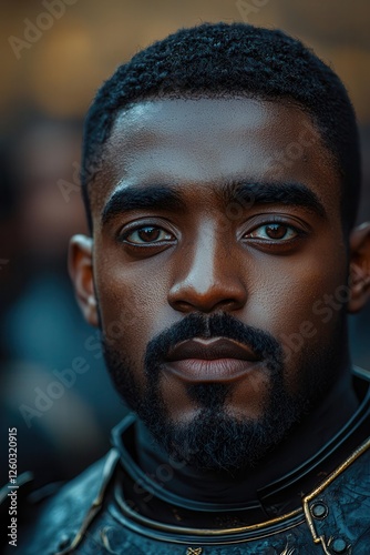 A striking portrait of a man in detailed armor, showcasing strength and determination, set against an atmospheric background that enhances the mood.