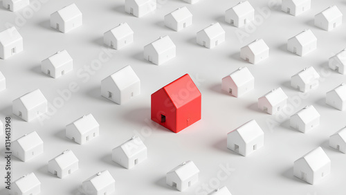 A striking red house stands out among numerous small white houses, symbolizing uniqueness and individuality in a uniform setting.