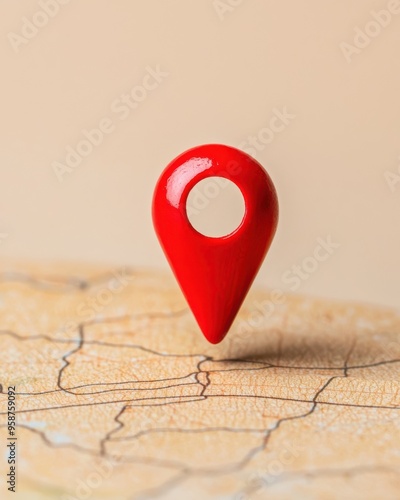A striking red map pin stands out against a beige background, highlighting navigation and location concepts.