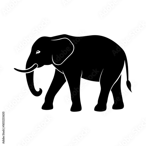 A striking silhouette of an African elephant in motion, showcasing its majestic form and tusks against a clean white background, perfect for design and illustrative purposes