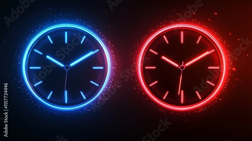 A striking visual of two neon clocks: one blue and one red, symbolizing time's duality.