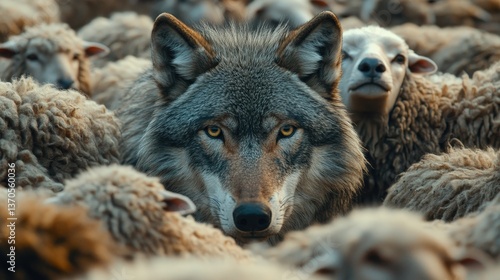 A striking wolf stares amidst a flock of sheep. Intense yellow eyes and a blurred background create a captivating, slightly unsettling portrait