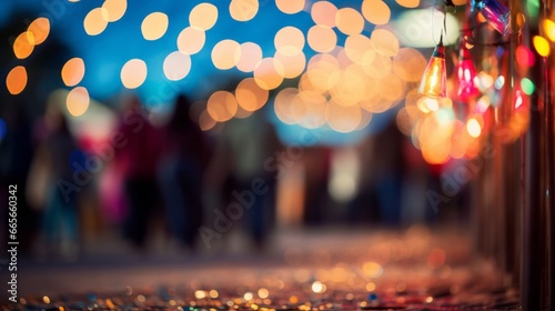 A string of decorative lights hanging in a line over a vibrant street fair. Shallow depth of field, bokeh and intentional blur.