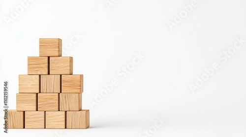 A structured arrangement of wooden blocks forming a pyramid shape on a white isolated background, perfect for educational or playful concepts.