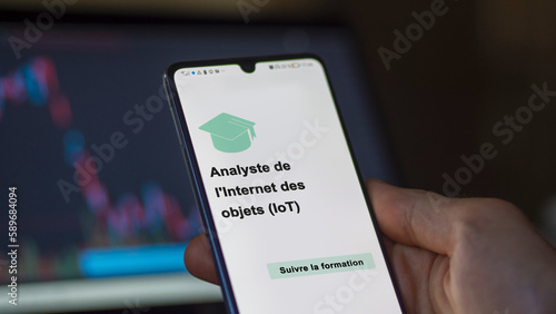 A student enrolls in courses to study, to learn a new skill and pass certification. Text in French: Internet of Things (IoT) analyst ; Enroll.