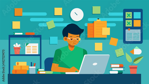 A students room is covered in sticky notes and spreadsheets as they meticulously plan and strategize the best way to navigate their loan offers.. Vector illustration