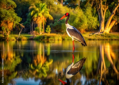 A studio lighting canvas captures the serene essence of a washed-out Saddle-billed Stork standing calmly beside a reflective lake surrounded by trees.