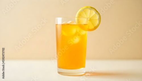 A studio shot features a clear glass filled with a vibrant orange liquid, topped with a slice of lemon