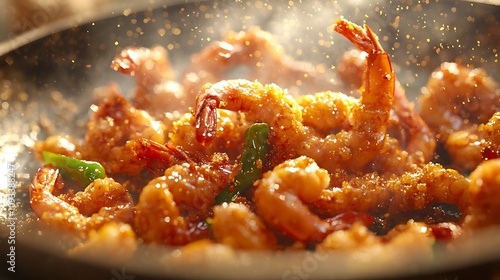 A stunning action shot of golden-brown fried prawns leaping from a sizzling frying pan, captured mid-air in a dramatic, coiling wave formation