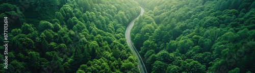 A stunning aerial photograph capturing a winding road cutting through a dense, vibrant green forest during summer, showcasing nature's beauty and tranquility.
