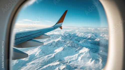A stunning aerial view from an airplane window showing the aircraft wing slicing through air over breathtaking, vast snowy mountain ranges under a clear blue sky.