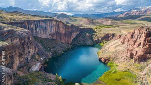 A stunning aerial view of a turquoise lake surrounded by rugged cliffs and lush greenery, set against a backdrop of majestic mountains and a dramatic sky.