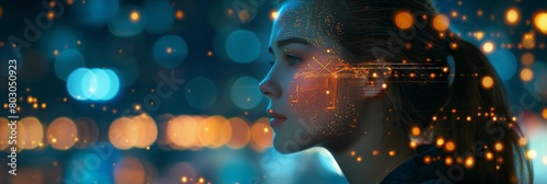 A stunning American lady portrayed alongside computer programming and urban illumination in a dual exposure.