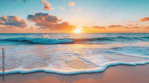 A stunning beachscape at sunset, with soft waves on golden sand and a vibrant sky in the background, creating a peaceful, picturesque scene.