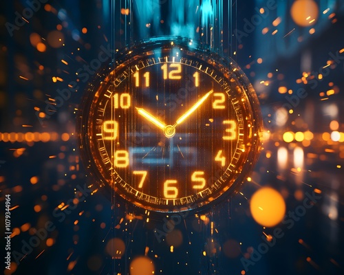 A stunning close-up of a clock face with glowing orange numbers, surrounded by a blur of lights, symbolizing the passage of time in a fast-paced modern world.