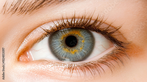 A stunning close-up of a human eye showcasing a mesmerizing blue iris with intricate patterns. The image highlights the beauty and detail of human vision.