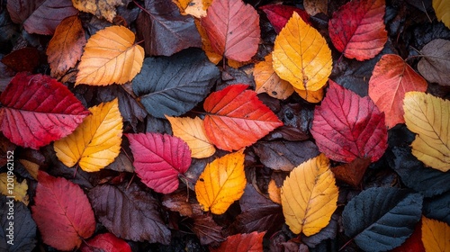 A stunning closeup of vibrant autumn leaves displaying a spectrum of fall colors creating a rich textural background