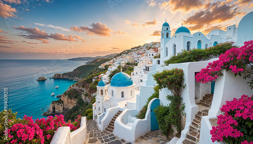 A stunning coastal village with pristine whitewashed buildings and blue-domed churches, perched on cliffs overlooking a crystal-clear turquoise sea.