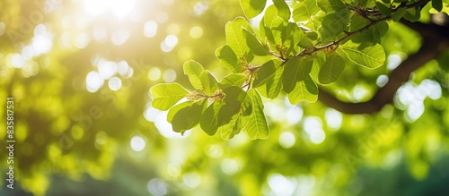 A stunning copy space image with sunlight filtering through the twisted branches of an impressive green tree.