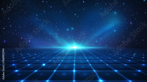 A stunning cosmic scene featuring a vibrant blue grid under a starry night sky, representing depth and infinite possibilities.