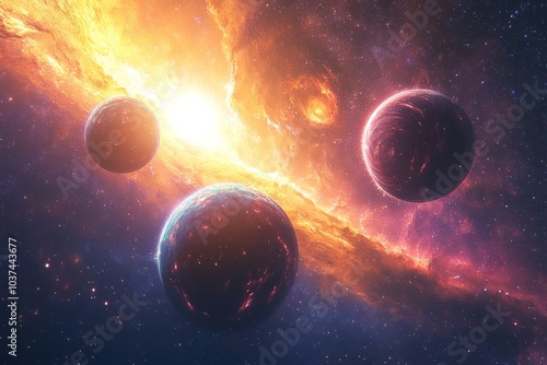 A stunning cosmic scene shows bright stars and colorful planets in the universe. This vibrant artwork inspires wonder and curiosity about space and exploration. Generative AI