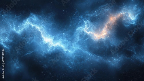 A stunning depiction of swirling blue and orange cosmic clouds in a vast universe during a starry night