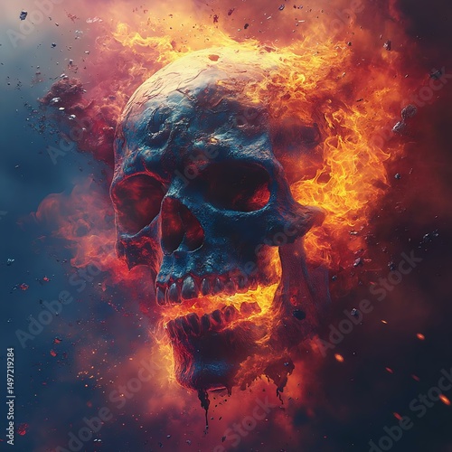 A stunning digital artwork of a fiery skull surrounded by swirling flames and debris, creating an intense and dramatic visual effect.
