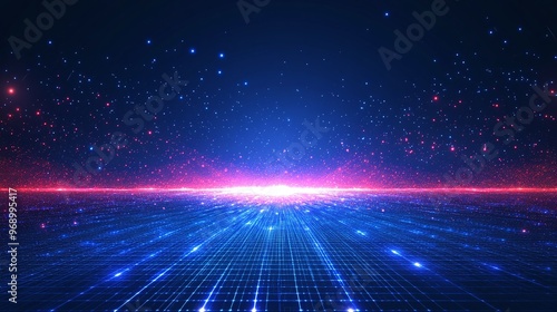 A stunning digital landscape featuring a vibrant, glowing horizon with a grid pattern, symbolizing futuristic technology and space.