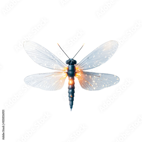A stunning digital representation of a glowing dragonfly, showcasing intricate translucent wings that sparkle with luminescence against a pitch-black background.
