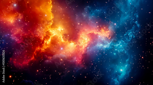 A stunning display of a colorful nebula filled with vibrant red, orange, and blue hues radiating in the vastness of space