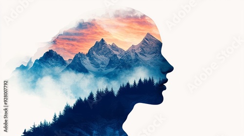 A stunning double exposure of a woman's silhouette blended with majestic mountains and a colorful sunset, symbolizing harmony.