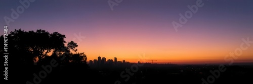 A stunning double exposure photo effect showing a silhouette of a tree overlaying a cityscape at dusk, blending, dusk, overlay