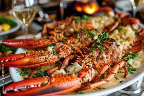 A stunning ensemble of succulent lobsters perfectly arranged on a table, ready to be savored and enjoyed, A grand display of lobster thermidor, AI Generated