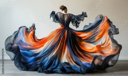 A stunning, flowing dress with intricate details and a dynamic mix of blue, orange, and black fabric, resembling a wave of colors