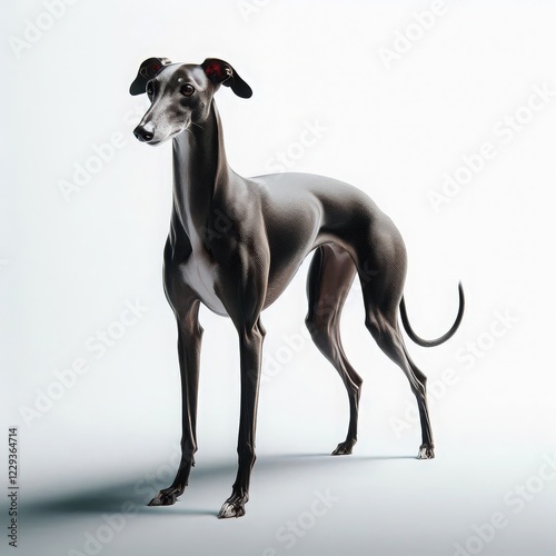 A stunning greyhound stands tall, its sleek body highlighted by gentle lighting. The minimalist backdrop enhances the dog's graceful posture and refined features, creating a captivating aura
