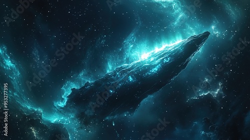 A stunning, highly detailed image of a cosmic scene featuring a massive asteroid or celestial body illuminated with a radiant blue light. The celestial body appears to be floating in the vastness of s