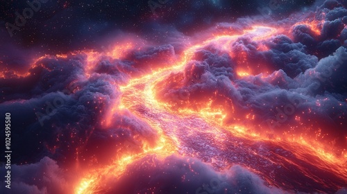 A stunning illustration of a fiery cosmic scene, showcasing a river of lava flowing through clouds against a starry background, evoking awe and wonder.